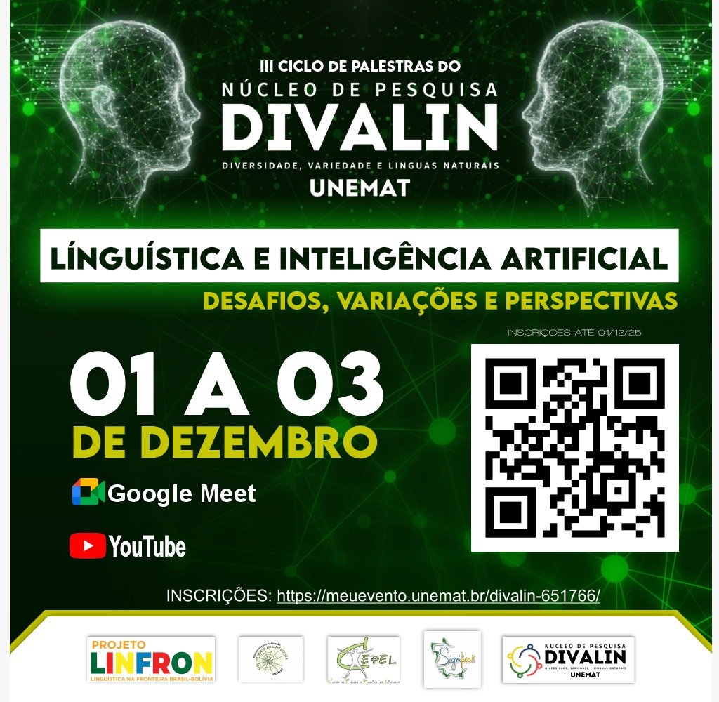 O Núcleo de Pesquisa Diversidade, Variedade e Línguas Naturais (DIVALIN), da Universidade do Estado de Mato Grosso (UNEMAT), tem o prazer de anunciar a realização do seu III Ciclo de Palestras. O evento de extensão ocorrerá de forma online nos dias 1, 2 e 3 de dezembro de 2025, e está aberto à comunidade acadêmica, à rede básica de ensino e a todos os interessados na discussão sobre a temática “Inteligência Artificial em contexto dos estudos linguísticos e educacionais”.